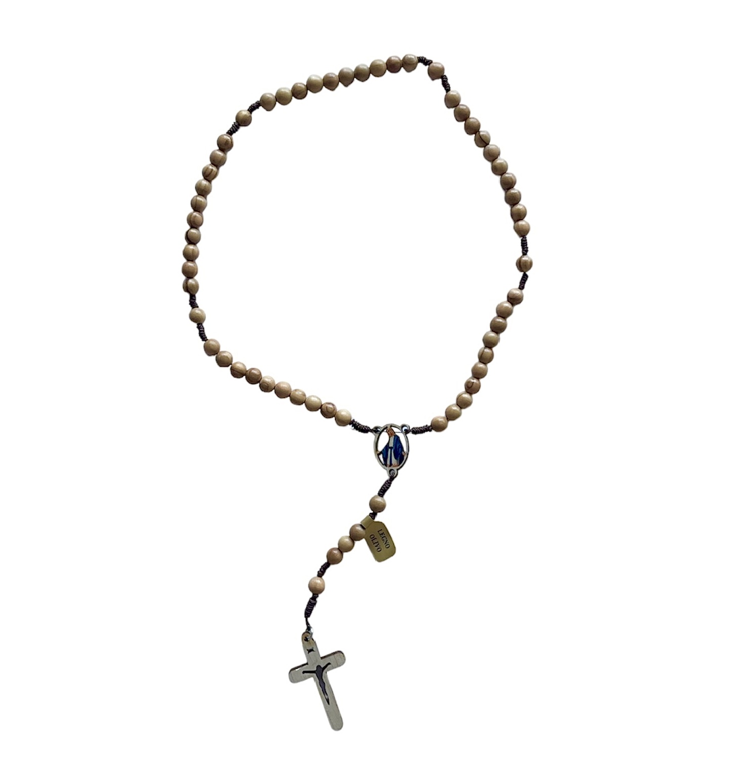 Ce chapelet est composé de grains en bois d’olivier sur corde, le diamètre des grains est de 7 mm, la longueur au coeur est de 22 cm.