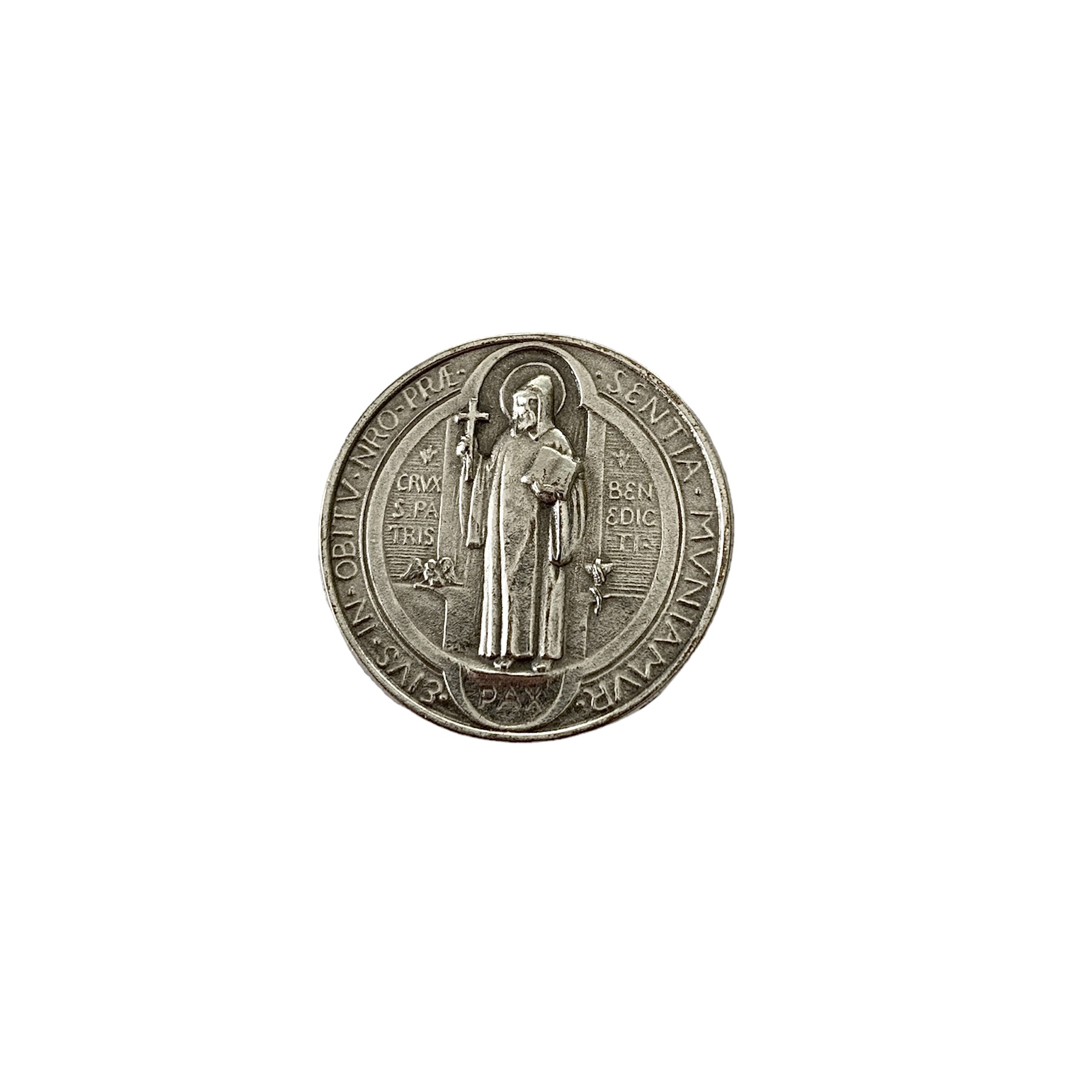 Jolie plaque auto aimantée représentant saint Benoît en métal argenté.