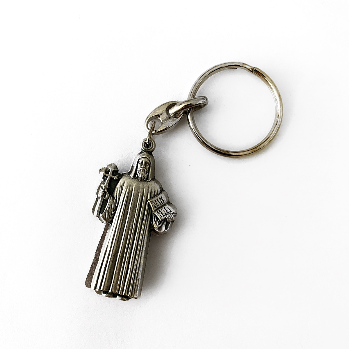 Porte-clés statuette de Saint Benoît ouvrant avec médaille gravée de Saint Benoît à l’intérieur.