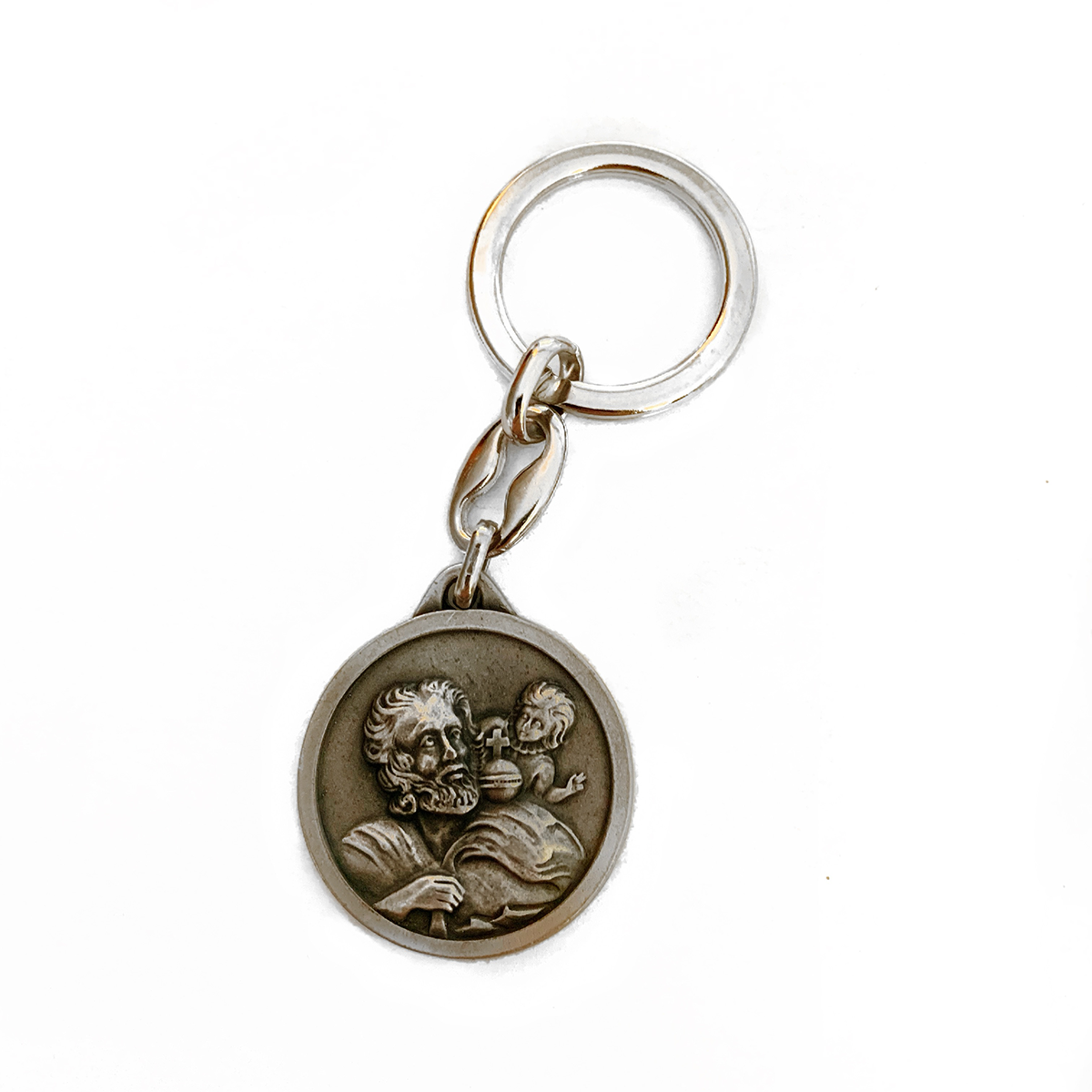 Porte- clés de saint Christophe en buste Ø 3 cm en métal couleur argentée. Ref. : 137PC